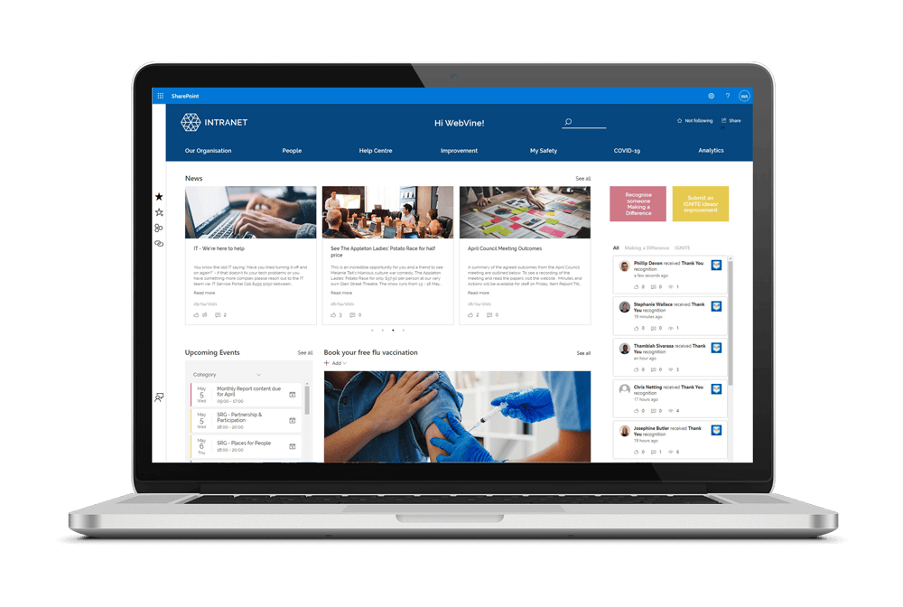 Injio was created by WebVine, a SharePoint and Microsoft 365 consultancy and Microsoft Gold Partner located in Sydney, Australia. WebVine are Digital Workplace experts with a passion for driving business transformation with technology. We have been integrating technology, people and business processes for more than ten years, using a proven framework to design and build innovative, exceptional solutions on Microsoft platforms.